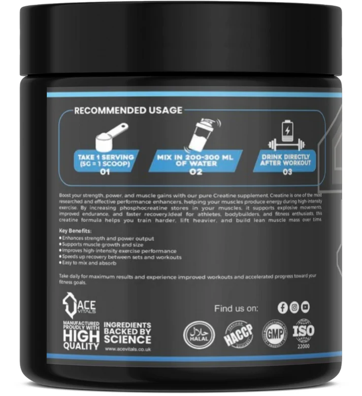 Ace Vitals Creatine + Electrolytes combines pure creatine monohydrate with a blend of electrolytes (sodium, potassium, magnesium, calcium) to support muscle strength, power, endurance, hydration, and recovery. Perfect for intense workouts.
