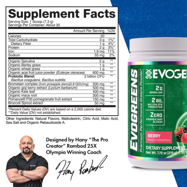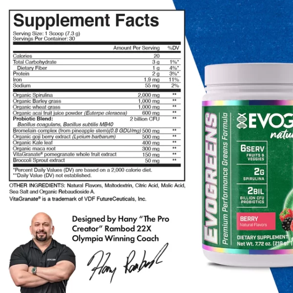 As a dietary supplement, mix 1 scoop with 10-12 fluid ounces or more of cold water, juice or your favorite beverage. Stir briskly or shake briefly in a closed container until mixed. Enjoy Evogreens at least once per day.