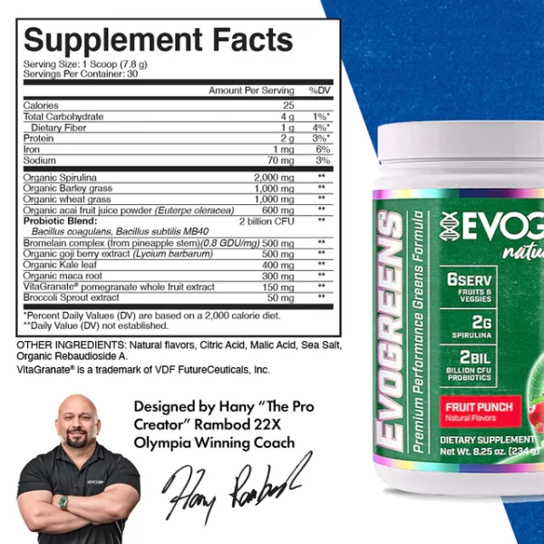 As a dietary supplement, mix 1 scoop with 10-12 fluid ounces or more of cold water, juice, or your favorite beverage. Stir briskly, or shake in a closed container until mixed. EVOGREENS contains natural, healthful organic plant-based ingredients. Please store EVOGREENS in your refrigerator after opening. This product is only intended to be consumed by healthy adults, 18 years of age or older. Do not use this product if you are pregnant, expect to become pregnant, or are nursing. Always consult with your physician before using this or any other dietary supplement product. Do not use this product without consulting your physician if you are using any prescription or over the counter medication or if you have any pre-existing medical condition. Immediately discontinue use and consult your physician if you experience any adverse reaction to this product. Do not use if safety seal is broken or missing. Store in cool, dry place away from moisture and sunlight. KEEP OUT OF REACH OF CHILDREN