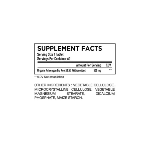 Experience the natural power of Certified Organic Ashwagandha, delivering a potent 500mg per tablet, standardized to 2.5% Withanolides for consistent quality and effectiveness.