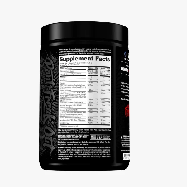 SUGGESTED USE: To assess tolerance, mix 1 scoop of infinite Fully Loaded Pre-Workout with 12 oz of cold water and consume 15-30 minutes prior to exercise. Advanced users may take up 2 scoops with 16-24 oz of cols water. Do not exceed 2 scoops per day.