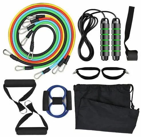 Fitness Bands Set includes 5 Tube Bands, 2 Cushioned Handles, 1 Door Anchor, 2 Ankle Straps, 1 Jump Rope, an 8-shaped Resistance Band, 1 Carry Bag, which help to vary your workout routines and challenge yourself to achieve higher levels. The resistance bands can be integrated seamlessly to improve your muscular endurance, strength, balance, flexibility, body awareness and co-ordination. Packed in the carry bag, the workout set will surely be a convenience and guarantee a much more interesting trip.